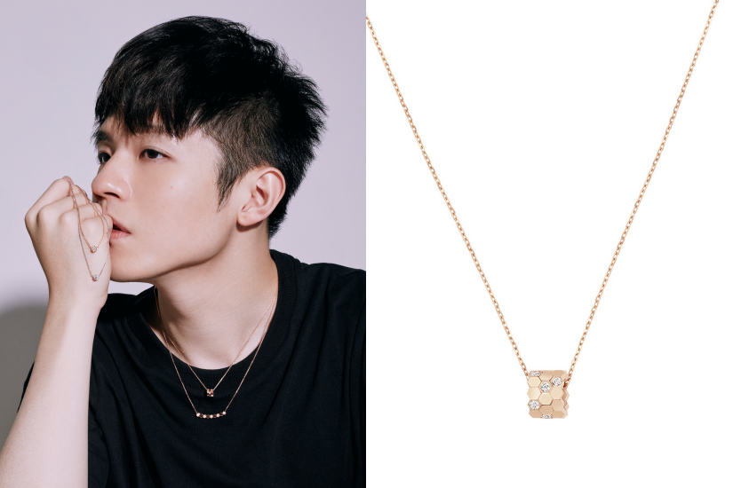 在另一套造型照中,Ian 手握著 Bee My Love 系列的新款吊墜。這款全新吊墜為一個由六個迷你六邊形組成的六角蜂巢設計,中間鑲嵌了一顆採用 Taille Impératrice 切割、擁有 88 個切面的鑽石,簡約精緻,適合於各種日常不同場合。