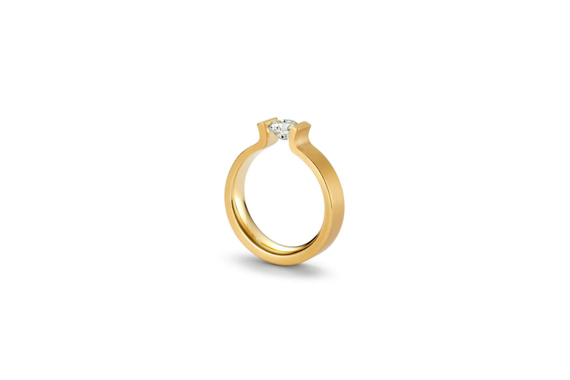 除了傳統的爪鑲,近年亦愈來愈多見卡鑲(Tension setting)設計。藉着戒圈金屬的張力,固定鑽石的腰部與底尖部分,就好似將鑽石懸空於戒圈中間,令鑽石的光芒差不多赤裸地畢露,時尚的外觀亦格外特別,突破傳統。