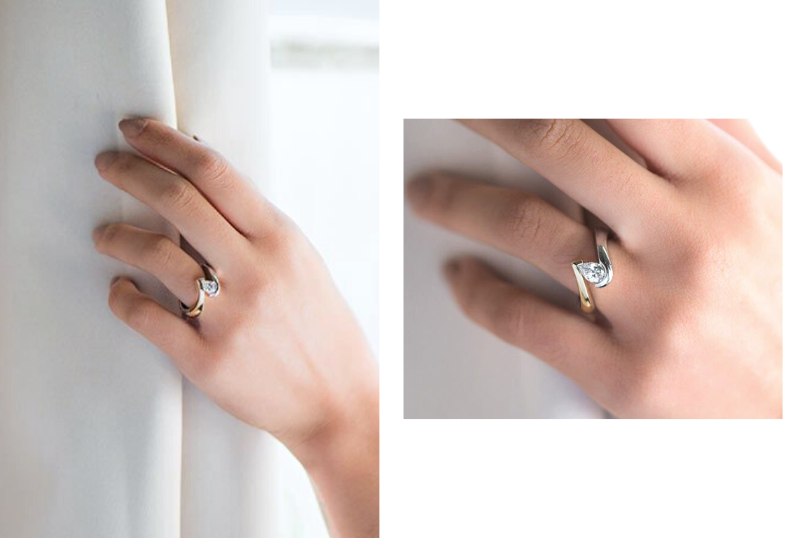 若想選擇圓形以外的切工鑽石,亦可考慮刻面數量與圓鑽相同的橢圓形切割,或者都能反射大量光線的梨形鑽石,其呈淚珠狀的輪廓亦有效修飾手指線條。