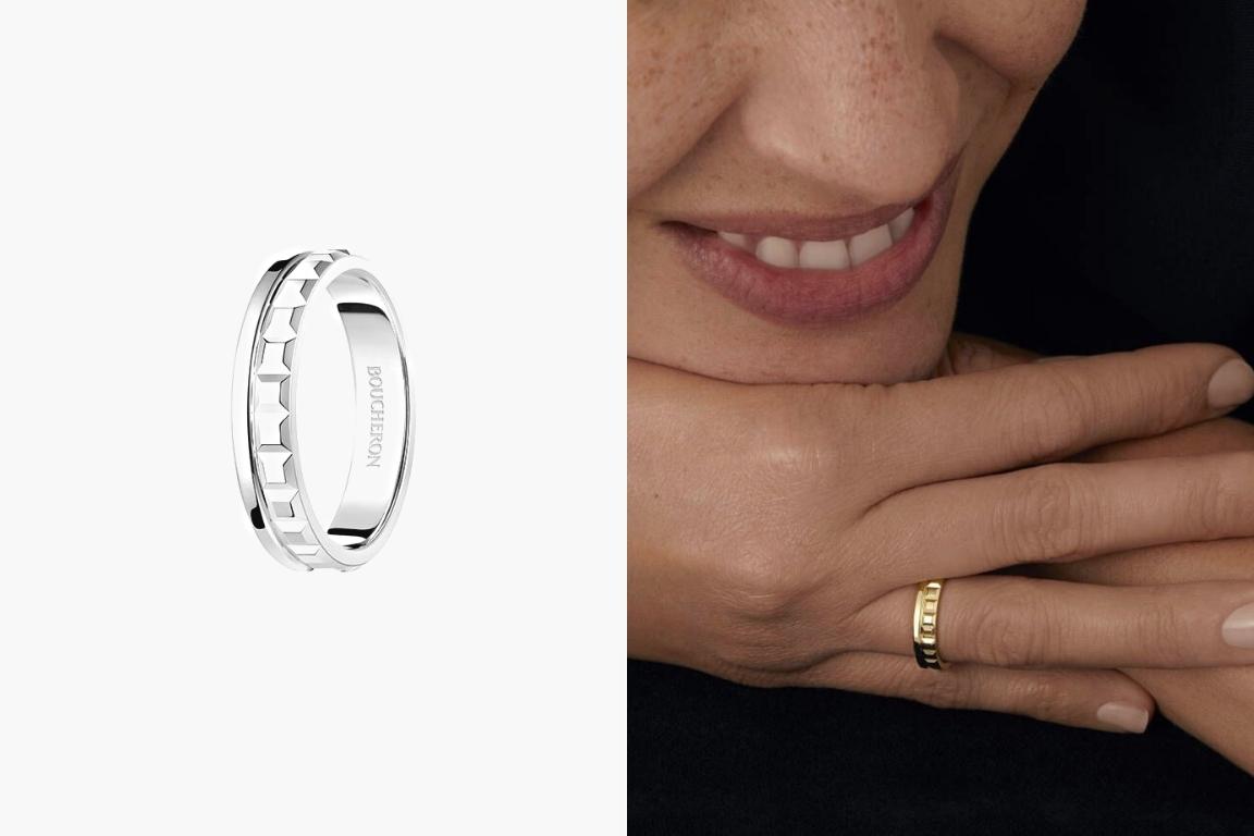 除了最簡潔的經典,帶有紋理的設計,亦是喜歡幼身婚戒的另一優雅系選擇。