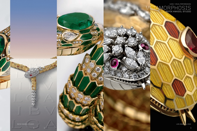 BVLGARI 和 Refik Anadol 將為參觀者帶來一趟身歷其境的旅程。這位藝術家開發的獨特人工智能技術將帶領參觀者穿越錯綜複雜和不斷變化的靈蛇,展示蛇的不斷重生和進化,同時播放音效和瀰漫著如 BVLGARI 香水般的香氣,為參觀者帶來忘我的全新體驗。機器學習演算法從超過 2 億張大自然圖像中進行訓練,產生一種令人著迷的視覺效果,呈現出模仿大自然紋理的另一種自然現實,讓人聯想起蛇的進化,並對蛻變的意義作出全新的詮釋。