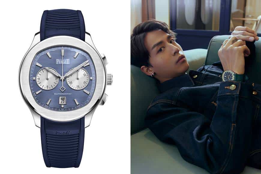 在佳節聚會中,Anson Kong 選擇戴上了 Piaget Polo Chronograph 腕錶,藍色面盤配上藍色膠帶的設計,與他的藍色牛仔套裝互相襯托着,這款腕錶不僅展現出 AK 對精細工藝和高雅設計的品味,更為他的整體造型增添了一抹慵懶灑脫氣息。