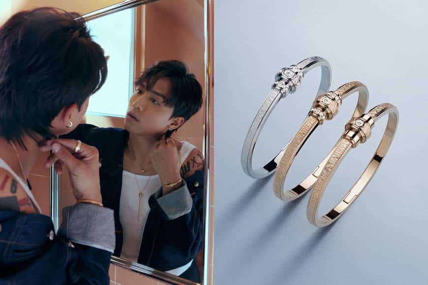 另外,AK 還配戴了多款 Possession 系列的玫瑰金及白金鑲鑽指環、手鐲和耳飾,這些珠寶閃耀的光芒猶如點點星光,讓他的整體造型呈現出節日的喜悅和奢華,成為聚會中的矚目焦點。