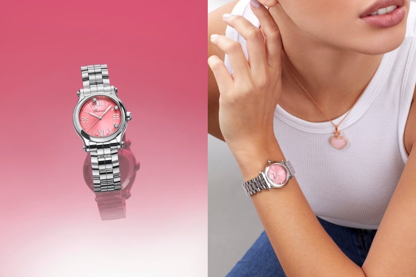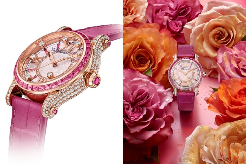 至於Happy Sport系列腕錶,則是呈獻給敢於突破自己的女性。自1993年誕生以來,這經典的系列憑藉錶盤中自在旋舞的標誌性靈動鑽石,上演一場充滿活力的視覺盛宴。這次Happy Sport系列推出的腕錶,分別採用30毫米或36毫米的錶殼尺寸設計,由Lucent Steel™精鋼製作而成,搭配粉紅色錶盤,溫柔浪漫。Happy Sport Rose de Caroline是Happy Sport系列的最新創作,也是品牌向此系列創作者Caroline Scheufele致敬之作。腕錶採用符合倫理道德標準的18K玫瑰金製成,鑲嵌珍貴寶石,寶石上的漸變粉紅色調賞心悅目。蕭邦錶廠的鑲嵌工藝師施展高超技藝,在中央飾以扭索雕紋的珍珠貝母錶盤上,以粉紅色藍寶石和紅寶石點綴36毫米直徑錶圈和時標,以華麗瑰美的全新裝飾,襯托此系列別具特色的靈動鑽石,令情人節更精彩非凡。