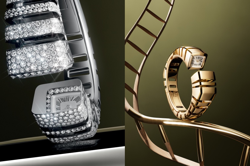 Reflection de Cartier 腕錶的精美錶盤與鏡面相對,時間彷彿在鏡中逆向流轉,錶盤鏡面如寶石般採用斜面處理,展現既精緻優雅又精準細膩的雙重個性 。這款跨界作品呈現多個款式,包括黃金和玫瑰金錶款,白色黃金鑲鑽錶款及兩種白色黃金鋪鑲彩色寶石錶款。白色黃金款腕錶透過不同的鋪讓寶石組合,探索材質之間的巧妙碰撞。雪花式鑲嵌與倒置工藝相輔相成,令作品綻放璀璨光芒。