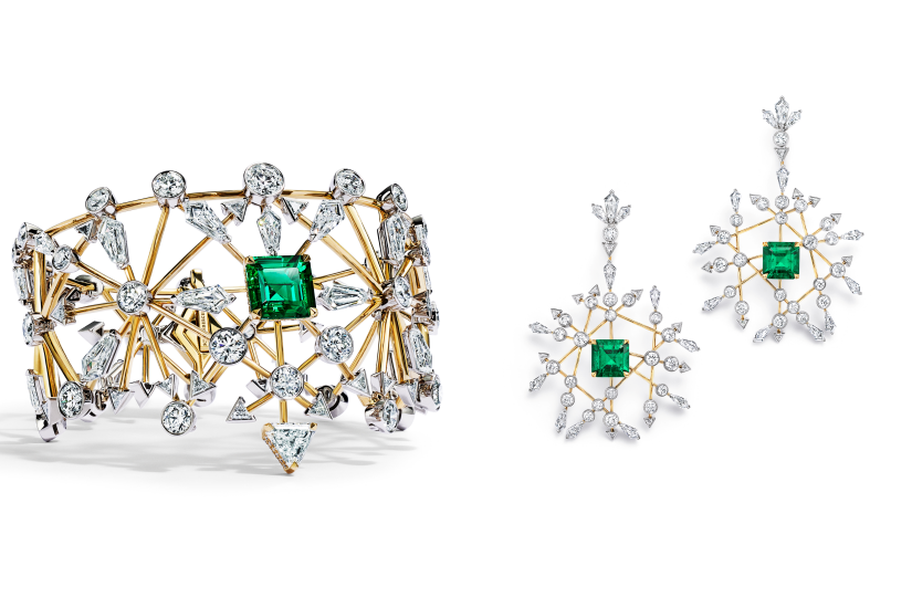 Arrow 作品靈感源自 Jean Schlumberger 於 1941 年為Tiffany 設計的 Trophée de Vaillance 胸針。Tiffany 工匠萃選多顆廣受推祟的天然哥倫比亞祖母綠,並研發出獨特的切割方式,以模仿箭頭的三角形結構。