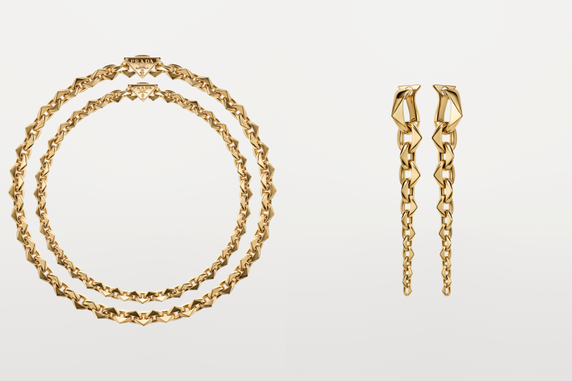 Prada 全新高級珠寶作品以嶄新的比例、重量和材質組合,重新演繹金屬鍊條。秉承系列的主體概念, 100% 以獲得認證的再造黃金打造。金屬鍊條是系列的主角,化身為手鍊、戒指、耳環和項鍊,並以全人手裝嵌,極臻精細的手工,將系列原有的 Made to Order 訂製款式換上更纖細的造型,卻不失時尚韻味。