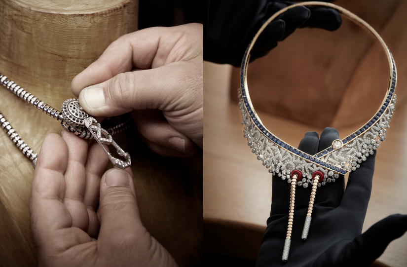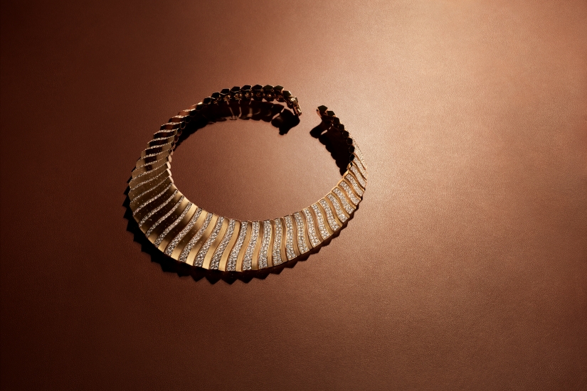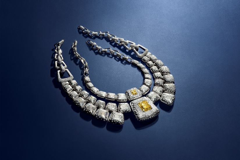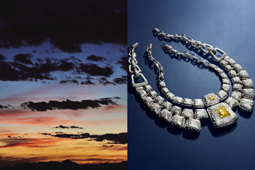 Terres d’Instinct 系列首發推出 16 套珠寶套裝,以不羈風格詮釋設計宣言。其中最受矚目的,莫過於 Kalahara 項鍊,它鑲嵌著兩顆珍稀黃鑽,其中一顆更重達近 35 克拉。這款項鍊不僅是鑲嵌工藝的非凡創舉,更融入了組合式設計巧思,可幻化四種佩戴款式:三圈胸飾、雙圈項鍊、項圈,或是搭配大吊墜款貼頸項鍊,展現佩戴者獨特的時尚風格。