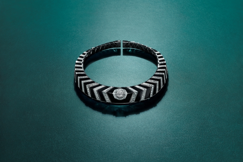 那身披條紋的生靈──斑馬,正是這套裝的靈韻之源。縵瑪瑙與長梯形切割鑽石交織呈現雕塑般的幾何美感,精準勾勒俐落線條,兩顆盾形切割鑽石則穩穩坐落在這款極具建築感的造型中央。
