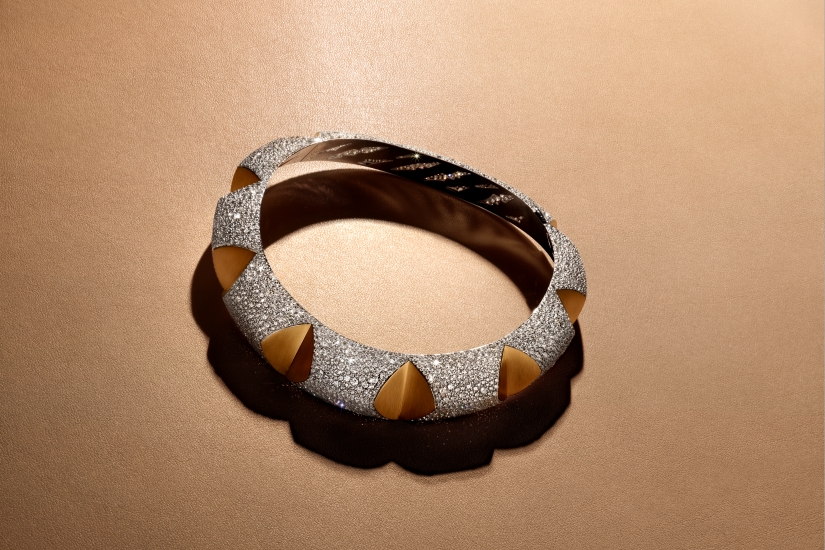 FAUVE套裝的砂金肌理,留著雄獅利爪撕裂的純粹形態 —— 凌厲的刻痕深深切入,又在密鑲鑽石的光芒中逐漸消融。力量無須張揚,卻在表層之下洶湧欲出,直抵感知深處。