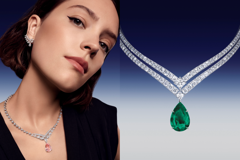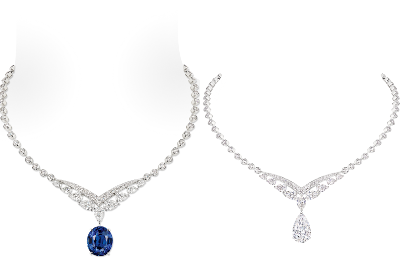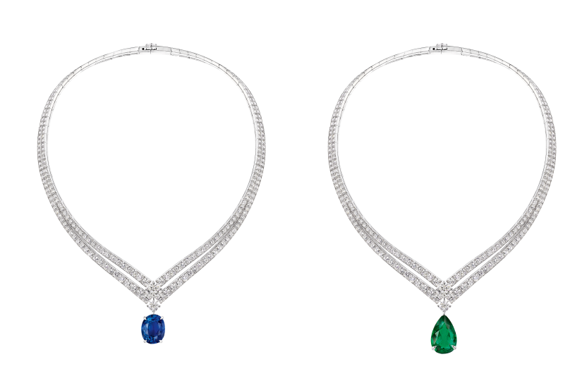 首條 Joséphine 項鏈鑲嵌一顆 31.25 克拉的橢圓形切割非凡錫蘭藍寶石,絲絨般的光澤流轉著靜謐華彩。第二款項鏈則以一顆迷人的 15.83 克拉哥倫比亞祖母綠為主石,其深邃而天鵝絨般的綠色攝人心魄。水滴形切割旨在致敬對這一形狀青睞有加的約瑟芬皇后。