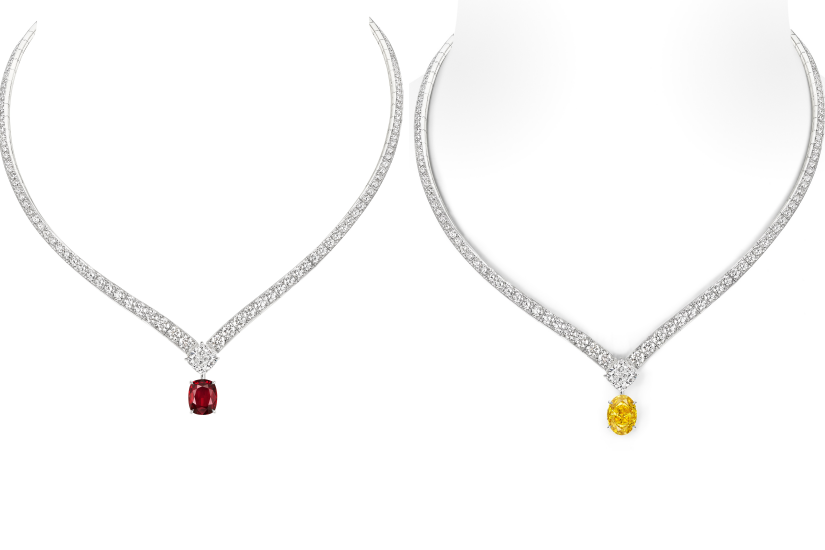 第三款項鏈上鑲嵌著一顆重達 5.88 克拉的橢圓形切割豔彩橙黃色 VVS2 鑽石,光彩奪目。第四款也是最後一款項鏈的焦點是一顆色彩濃郁的莫桑比克紅寶石,引人注目且充滿魅力。枕形切割的 3.61 克拉紅寶石令人聯想起品牌創始人尼鐸 (Marie-Étienne Nitot) 為拿破崙加冕之劍鑲嵌的傳奇鑽石 – 攝政王鑽石。