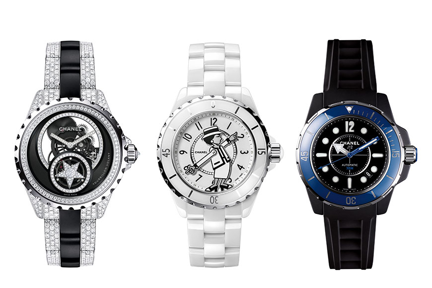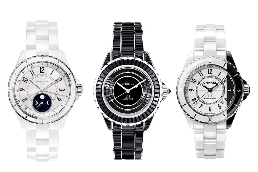 2000 年,Chanel 推出 J12 腕錶,首次把陶瓷應用為鐘錶製作材質,震撼鐘錶界,更改寫鐘錶歷史。20 年來,J12升級出不同版本,包括有黑色陶瓷腕錶、加入陀飛輪裝置、配有深度達 300 米的防水性能等等,衍生出 J12 Chromatic、J12 Moonphase、J12 Skeleton Flying Tourbillon 等不同廣為人知的新版本。
