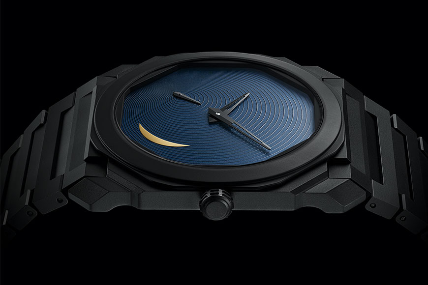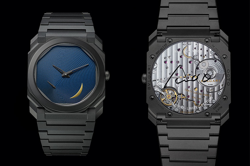 另一款焦點落在與日本建築大師安藤忠雄合作的限量版超薄黑陶瓷錶 BVLGARI Octo Finissimo Tadao Ando 上。簡約的外型符合安藤忠雄的設計風格,並以其鍾愛的「時間」為主題,糅合三日月(Mikazuki)元素打造出160枚限量設計。