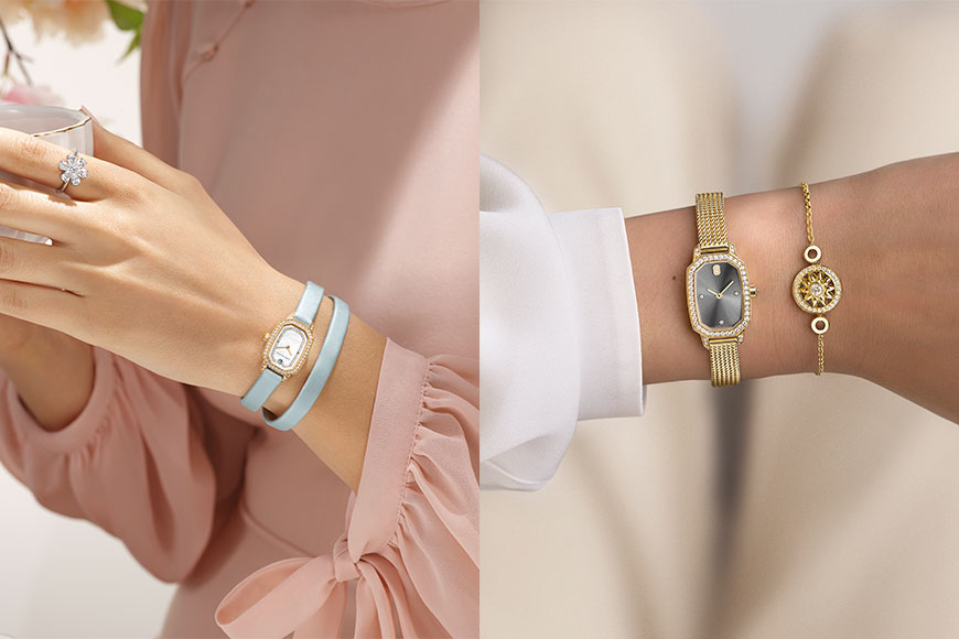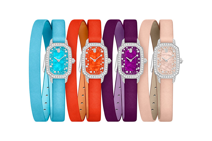 系列不同款式的錶款,均有專屬的錶帶,包括配襯錶盤色彩的緞面雙圈錶帶,以及貼合手腕的18K金米蘭織紋錶鍊;而33毫米腕錶,則配搭經典的鱷魚皮錶帶。無論18毫米還是33毫米的錶款,錶殼均採用18K白金、玫瑰金或黃金打造,同時亦備有石英及機械款式選擇。
