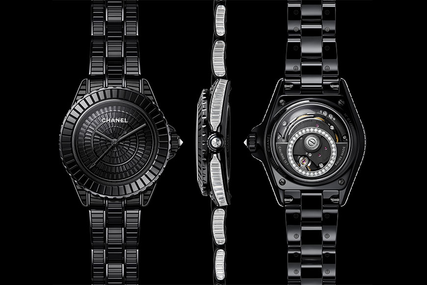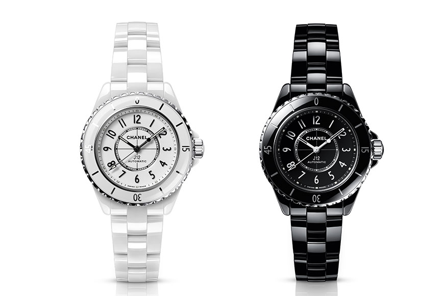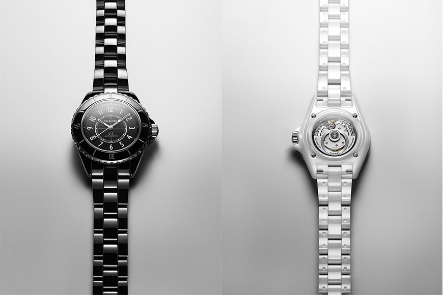 J12 Caliber 12.2 33 毫米自動腕錶備有黑色或白色耐磨陶瓷型號以供選擇。兩色皆用上藍寶石水晶玻璃底蓋,及藍寶石水晶玻璃單向旋轉錶圈,黑色漆面錶盤刻上白色陶瓷數字時標;白色漆面錶盤,則刻上黑色陶瓷數字時標。