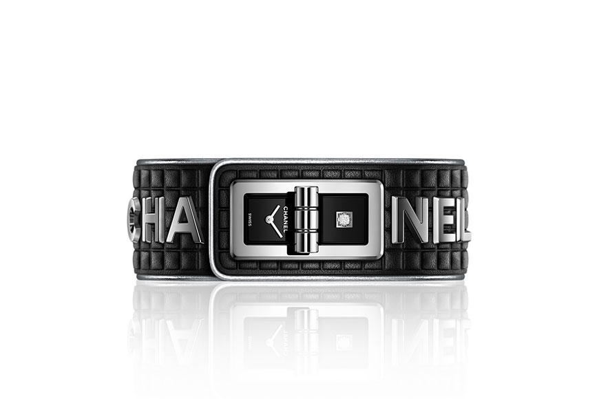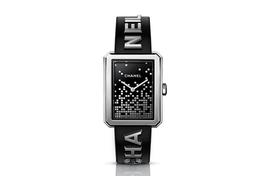 BOY·FRIEND WANTED DE CHANEL 腕錶以精鋼打造六個 CHANEL 字母鉚接裝飾於皮革錶帶上。錶殼一側為「CHA」,另一側是「NEL」字樣,襯托90年代馬賽克風格設計的黑色漆面錶盤。