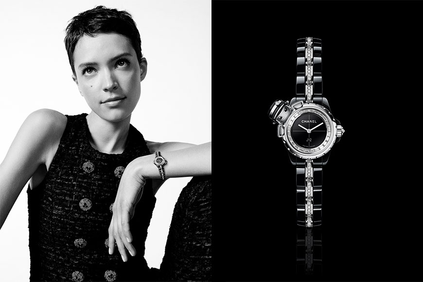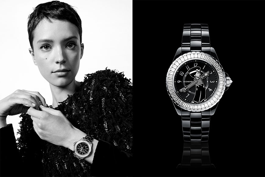 外型可愛的 Mademoiselle J12·XS,可見 Chanel 女士戴上草帽以立體的方式出現在錶盤上,充滿玩味趣意。