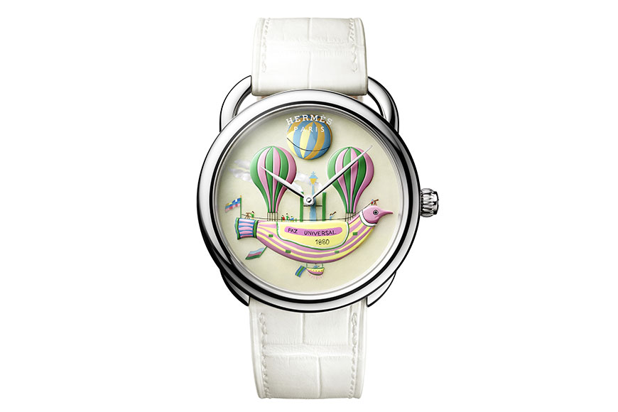 今年以「漫遊時光」為主題的 Hermès 錶展,透過鐘錶設計來一趟遠走高飛的旅行。因此品牌特別在 Arceau 腕錶上,參考 Loïc Dubigeon 於1984年設計的「Les Folies du Ciel」絲巾圖案,透過繪畫、鐫刻等工藝重現了看似熱氣球和飛艇的可愛圖案,以表揚空氣動力學的發展,同時讚揚人類追求翱翔天際,飛得更高的理想。