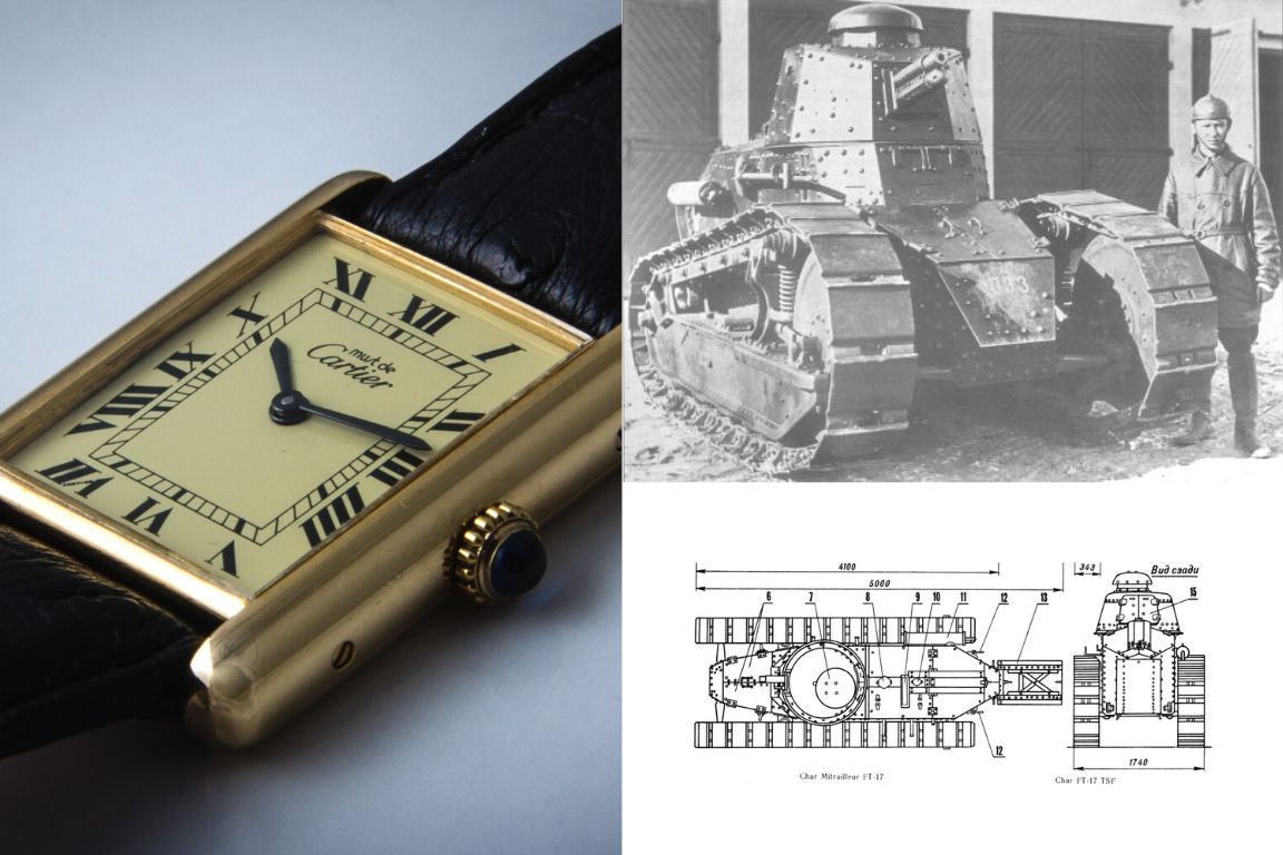 早自 1917 年,第一次世界大戰期間,品牌創辦人 Louis Cartier 受當時法國戰略革新之作雷諾 FT-17 坦克啟發,以俯瞰坦克的靈感設計並發表第一款 Tank 簡約腕錶。平行方形的新輪廓,配合藍寶石錶冠,打破維多利亞時代女性的奢華珠寶腕錶,以及後期男性陀錶固有的曲線造型。