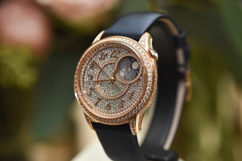 Égérie 密鑲鑽石月相腕錶的錶盤以白金材質打造,錶盤邊緣、中央圓環和月相環則以粉紅金製成,錶盤及錶殼共鑲嵌 845 顆鑽石,珍珠貝母月亮在霧面金屬質感的藍寶石水晶雲朵後時隱時現。Traditionnelle月相腕錶的 548 顆鑽石,共 548 顆的圓形明亮式切割鑽石鋪鑲於盤面上。錯落有致的鑽石交映出璀璨華彩,彷彿與光影融為一體。