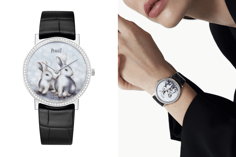 Piaget 以限量版 Altiplano 時計向此東方文化節慶致敬,推出以大明火掐絲琺瑯來呈現每年生肖的獨特腕錶。錶盤飾有兩隻發光的兔子,象徵著希望與長壽,搭配直徑 38 毫米且鑲嵌 78 顆明亮式圓形切割鑽石的18 K白金錶殼。