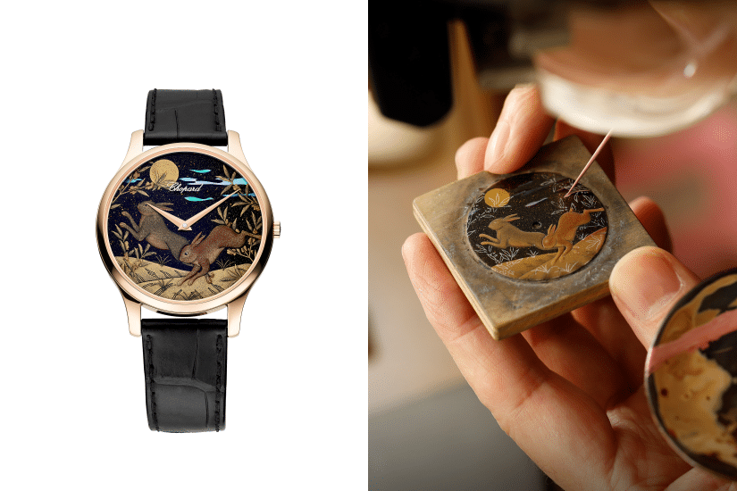 Chopard 為喜迎兔年,帶來兩款兔年腕錶。L.U.C XP 兔年蒔繪腕錶將金藝與漆藝巧妙結合,融匯精妙機械工藝與精湛手工技藝。直徑 39.5 毫米的18K 玫瑰金錶殼,錶盤上呈現一輪皓月下機敏靈動的玉兔,展現中國神話中以「玉兔」指代月亮的傳統。融入金粉與珍珠母貝微粒的蒔繪錶盤由日本工藝大師運用具有百年歷史的古老蒔繪技藝製作而成,搭載 L.U.C 96.17-L 型錶廠自製機芯,動力儲存達 65小時。