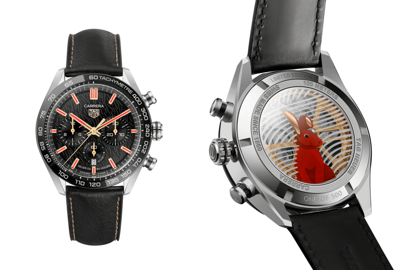 TAG HEUER 兔年限量計時腕錶,以農曆「兔年」為主題,代表福氣、喜悅、熱情與勇敢的紅色作點綴貫穿整體設計。限量版腕錶以錶殼直徑 44 毫米的 TAG Heuer Carrera Chronograph 為藍本,優雅的精鋼錶殼與深邃黑色陶瓷固定測速錶圈,以呼應這系列與賽車運動的淵源,定制設計的錶盤上面印有代表兔子柔軟皮毛的線條。錶背設計特別經精心構思,屬錶主專享。藍寶石水晶玻璃錶鏡中間呈現一隻紅色兔子的印刷圖案,四周特別鐫刻「One of 500」與「Limited Edition」以顯腕錶的限量珍罕。
