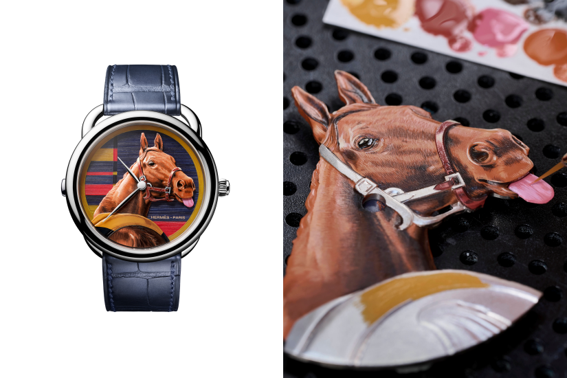 這款全新亮相的 ARCEAU Rocabar de rire 工藝腕錶,錶盤採用俏皮的動偶裝置,以及雕刻、微繪和馬鬃毛鑲嵌工藝,重新詮釋了 Dimitri Rybaltchenko 為 Rocabar de rire 絲巾設計的頑皮馬兒 ,按下 9 點鐘位置按即可看到馬兒吐舌頭的動作,搞笑、古怪得讓人會心微笑。腕錶搭配 41 毫米白金錶殼與深海藍鱷魚皮錶帶,採用愛馬仕自製 H1837 機芯驅動,透過藍寶石水晶錶底蓋,可以欣賞到夾板橋和自動盤上的精細打磨加工和H字母雕飾。此款腕錶限量發行 12 只。