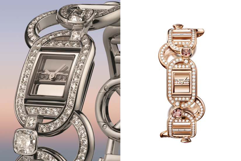 愛馬仕憑藉全新 Maillon libre 系列,將標誌性的 Chaîne d’ancre 錨鏈元素,演化為腕錶與胸針。兩款新作獨具一格的極致個性和多樣的佩戴方式,手鍊式腕錶外形如波浪般起伏,蘊藏著複雜的製作工藝,並在中央鑲嵌鑽石或紅色碧璽,錶殼與錶鍊造型融為一體,增添一絲俏皮和驚喜。
