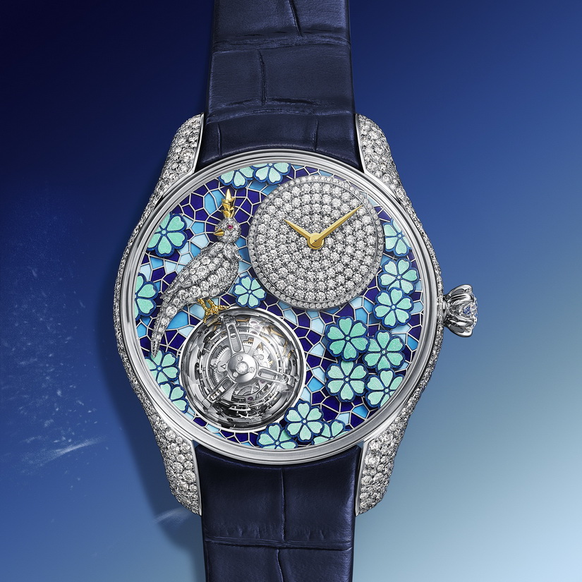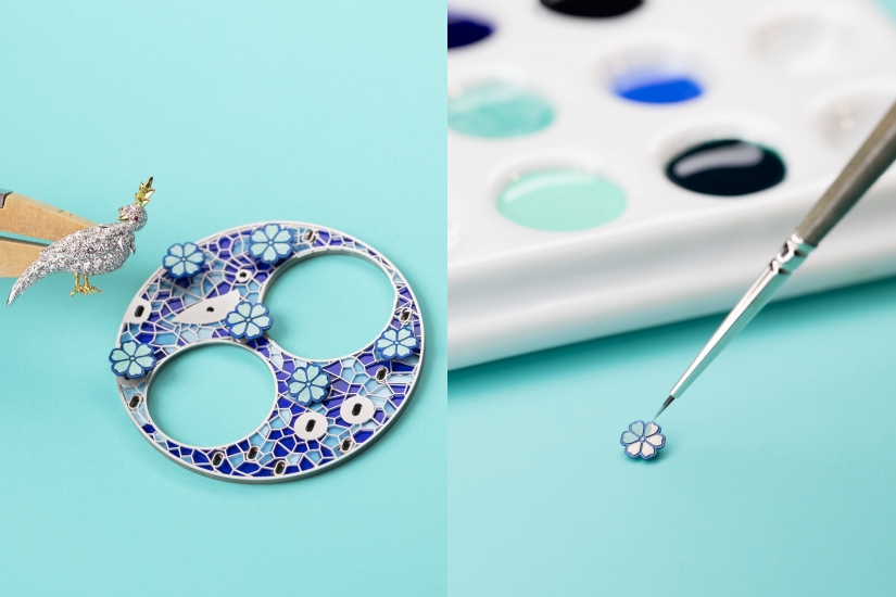 錶盤工藝集結五項高難度技術,包括內填琺瑯、手繪漆面、微型黃金雕刻、雪花鑲嵌與藍寶石刻面。整個琺瑯與漆繪過程耗時達80小時,而小鳥則由工匠花費40小時以18K金手工製作並鑲嵌70顆鑽石,完美體現藝術與技術的結合。藍寶石水晶錶背下可見兩枚星形板橋,其設計靈感亦來自六爪鑽戒,尖端經高度拋光處理,與整體腕錶造型互相呼應。