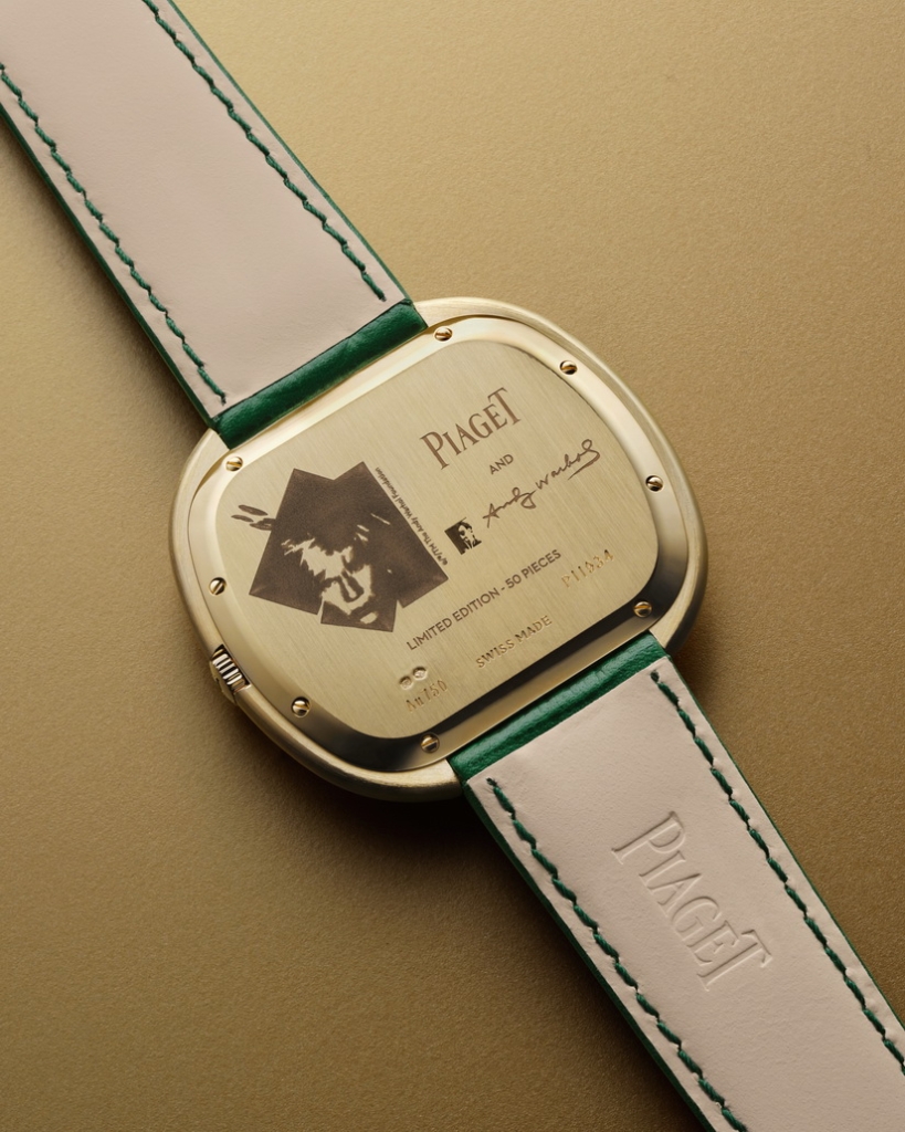 錶背同樣以18K黃金製成,經垂直緞面打磨處理,並鐫刻出一幅根據Warhol自拍像轉化而成的抽象肖像圖案,連同PIAGET品牌標誌與Andy Warhol的簽名同時出現,賦予腕錶明確的藝術身份。錶冠上亦鐫刻品牌標誌,設計細節與整體風格一致,展現工藝一致性。