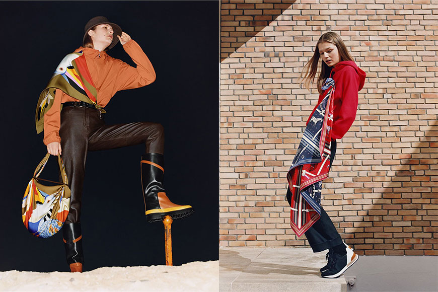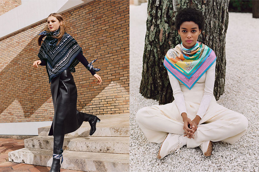 除了手袋,絲巾可謂是品牌的另一王牌。香港女生愛隨身攜帶一條絲巾/披肩保暖,Hermès 的絲巾可謂是入門的最好選擇。絲巾的配搭用途多不勝數,除了可綁在手袋上、在身上也能變化出千種造型。
