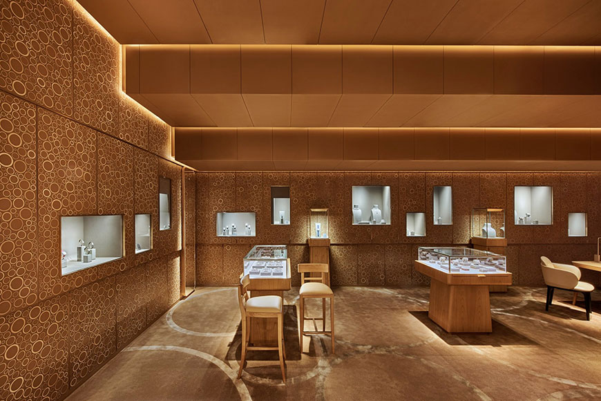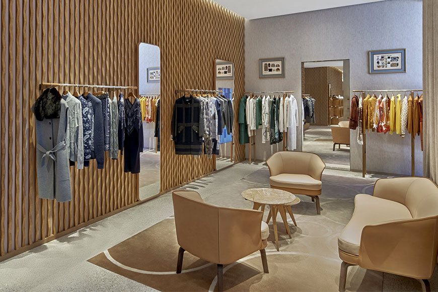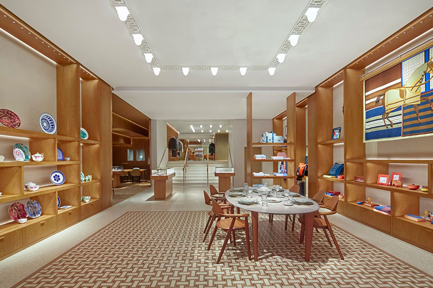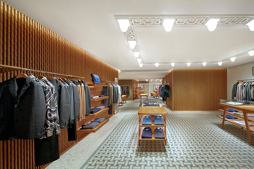 新店無論外內都流露著高貴典雅氣質,外牆鋪滿了起伏有致的鋁合金瓦片,在閃爍的燈光下饒富動感;室內設計則由巴黎建築事務所 RDAI 操刀,將品牌的經典元素如馬賽克地磚及希臘回紋天花燈飾,融入新店裝飾,同時能達到劃分成不同專區的功效。挑高的天花和獨特的「L」形空間,加上明亮的水磨石地板和奪目的用色,令空間感十足,予人一種非常舒服寫意的氛圍,加上四周的品味佈置,漫步其中都是一種享受。