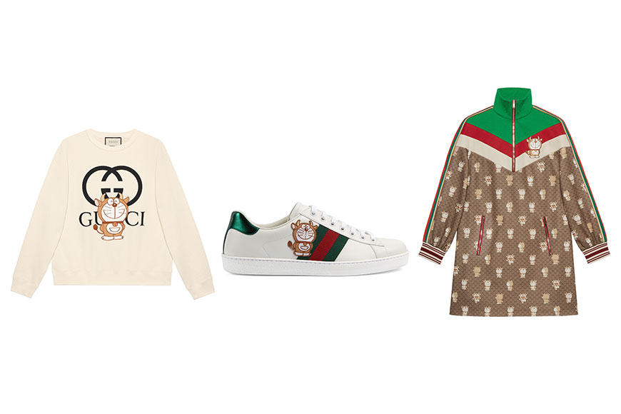 多啦A夢除了以經典藍色造型出現在 Gucci GG 碎花或單個 GG 圖案上,更呼應牛年以俏皮牛牛扮相登場,喜氣的金色,加上頭上兩個小牛角,非常可愛。系列包括鞋履、行李、手袋、小型皮具及帽子。所有款式綴有紅色皮革飾邊,帶有流露濃厚的復古味。