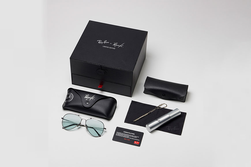 木村拓哉 x Ray Ban Aviator 聯乘太陽眼鏡以 Ray Ban 經典飛行款式 Aviator 為靈感,黑灰琥珀的鈦金屬鏡架於日本製造,而墨鏡的鏡腿末端飾上了木村拓哉的手寫姓名縮寫「T.K.」,流露簡約俐落的型格。配搭的淺藍「Evolve」鏡片更能隨著紫外線而調光,適合於室內及戶外配戴。
