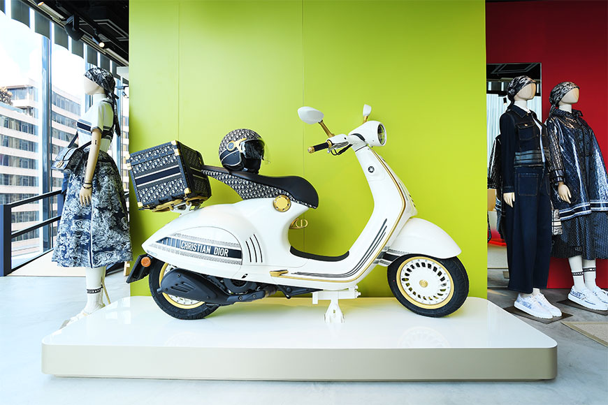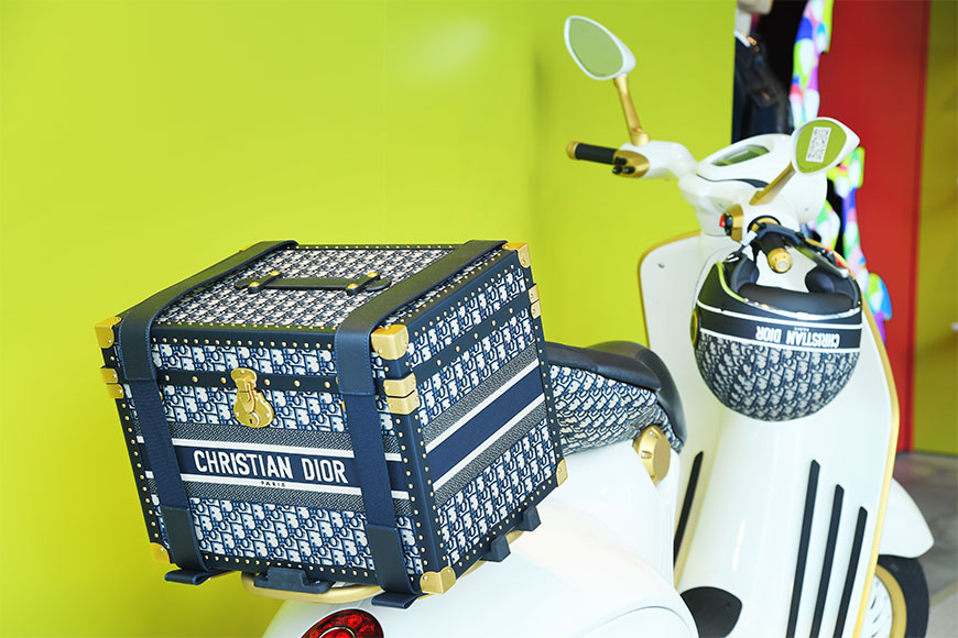 除了可以找到多款滿載夏日風情的單品之外,期間限定店更展示 Dior 與意大利著名電單車品牌 Vespa 攜手設計的 Vespa 946 Christian Dior 電單車,是系列中的限量產品。由 Maria Grazia Chiuri 設計的全新款式是經典 Vespa 946 的現代變奏,其一體式結構和含蓄簡潔的線條,流露優雅品味,更同時推出飾有 Dior Oblique 圖案的頭盔及尾箱。
