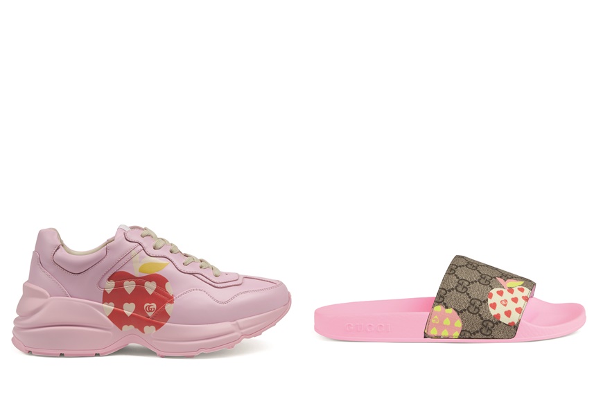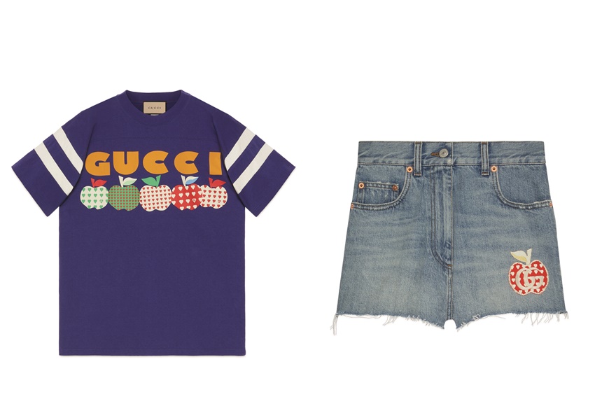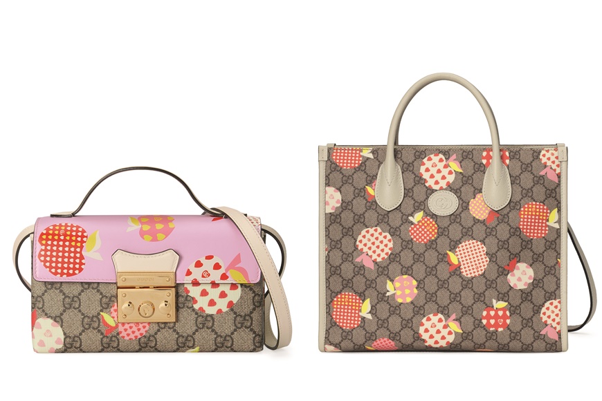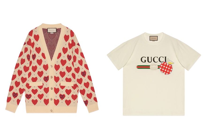 貫徹品牌繽紛玩味風格,系列以可愛浪漫的蘋果心形圖案為主軸,點綴 Gucci Logo,或疊印在經典的 GG Monogram上,包括男女裝服飾、鞋履、帽子、小皮具等,流露可愛氣息。
