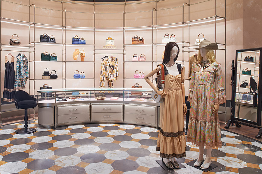 整個旗艦店揉合當代美學與意大利傳統,外牆由大理石組成的幾何圖案致敬佛羅倫斯建築風格;在店內,每一個細節都包含著 Alessandro 對美的追求,你會發現無論 Fitting Room 裡面的一塊鏡、一張檯,店裡擺放的一張扶手椅或梳化都是古董收藏,價值連城,更凸顯品牌的氣派。地板則用上了最矜貴的意大利雲石和竹製木板,與 Bamboo 1947 手袋來個隔空呼應,也回溯品牌歷史。