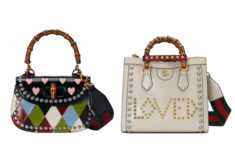 系列的一大亮點,必要是綴有經典竹節手挽的 Gucci Diana 與 Bamboo 1947 手袋, Gucci Diana 手袋以飾釘拼出「Love 」字樣,大力高呼愛意;另一款 Gucci Diana 手袋利用鏤空設計,拼貼出藍色心形圖案,可愛度十足。 Bamboo 1947 手袋則利用菱形皮革呈現拼貼撞色效果,結合心形圖案與飾釘元素,帶來玩味新詮釋。
