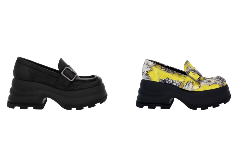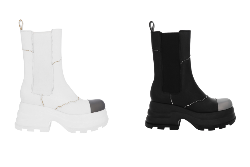 這次以 Charles & Keith 最具代表性的 Chelsea boots 與 Loafer 為藍本,並換上全新輪廓,均採用帶有頹廢搖滾街頭風的實驗性弧形橡膠厚底。這種雕塑性的厚實輪廓承襲自上世紀出沒在倫敦鬧區 Camden 和東京原宿的年輕人風格,並以鞋上金色填補的破 碎接縫和鍛造金屬鞋頭呈現混亂社會成規之間的交互影響。