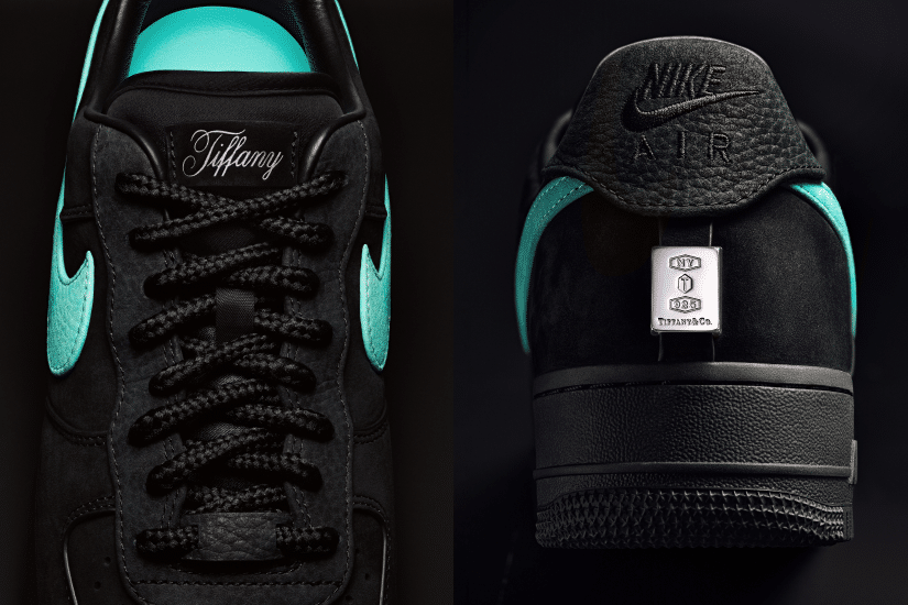 為慶祝 Nike Air Force 1 誕生 40 週年,Tiffany & Co. 與 Nike 宣布首度聯乘。這次聯乘企劃中的 Air Force 1 1837 運動鞋以頂級黑色麂皮巧製,鞋身綴上 Tiffany Blue 色調的 Swoosh 勾形標誌,兩邊鞋踭上方以銀色聯乘細節粉飾,並配上 Tiffany Blue 的鞋盒。