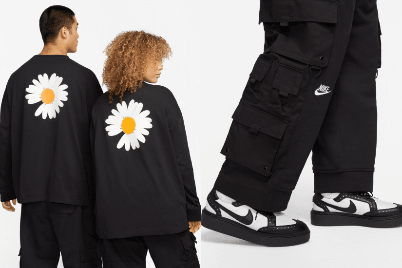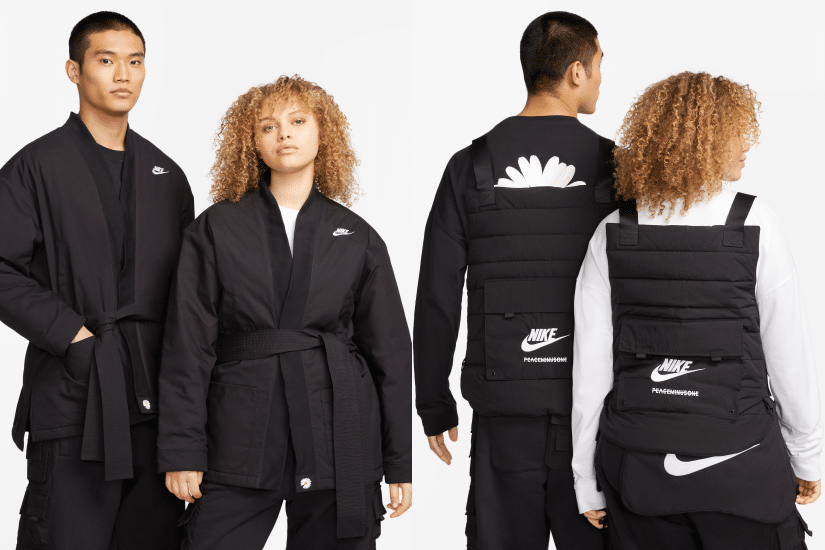 至於服裝系列產品包括長褲、長袖 T 恤、寬鬆剪裁的外套及背心外套,將 Nike 與 G-DRAGON 品牌 PEACEMINUSONE 標誌以及代表性的雛菊圖案以刺繡和絲網結合,加上金屬扣環等展現了對細節的重視。寬鬆和服外套可與背心分拆組合穿搭,而長褲上的腰帶可連繫配件腰包。