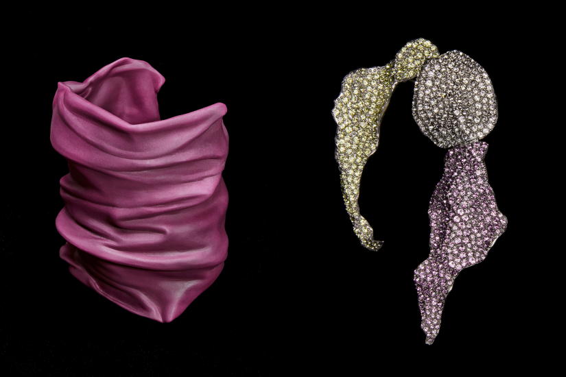 Lynda Benglis 為 Loewe 2024春夏女裝系列所設計的珠寶作品,共有二十款設計,以可穿戴的雕塑為構思。Lynda Benglis 一直醉心研究開拓物料素材及技術的可能性,將物料屈曲打結、打褶、傾注及擠壓成形。她在墨西哥州 Santa Fe 的工作室,運用薄箔、金屬網、黏土、金屬線和聚氨酯等物料製作首飾模型,然後轉化成以18K金、純銀、鋁金屬、琺瑯及水晶製成的戒指、手鐲、胸針,耳環及吊墜等首飾,每一件都如是可以佩戴在身上的藝術品。