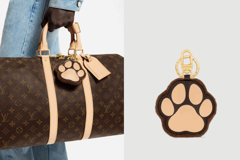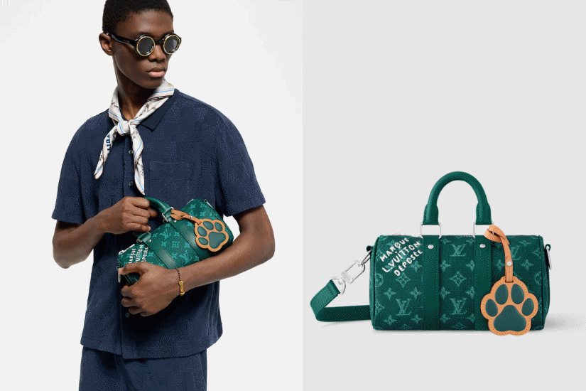 這款 Keepall Bandoulière 25 袋款,採用 Monogram Heritage 帆布打造,綴有色調相襯的皮革飾邊。Pharell Williams 以源自 Damier 帆布的「Marque L.Vuitton Déposée」標誌裝飾袋款,重點是配襯點綴 LV Initials 壓花圖案的小狗掌印吊飾。