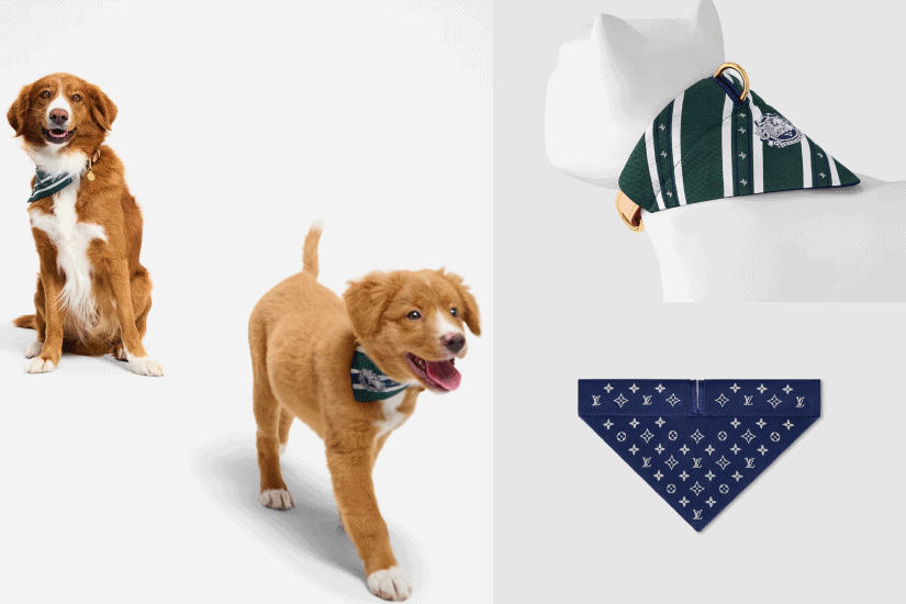 除了帽子,更有品牌首款為狗隻設計的紡織精品,設計靈感源自男裝領帶的瀟灑氣質,採用雙面設計,一面採用綠色設計,另一面則以海軍藍色搭配 Monogram 圖案,能輕鬆點綴頸圈,並可完美配襯狗帶。