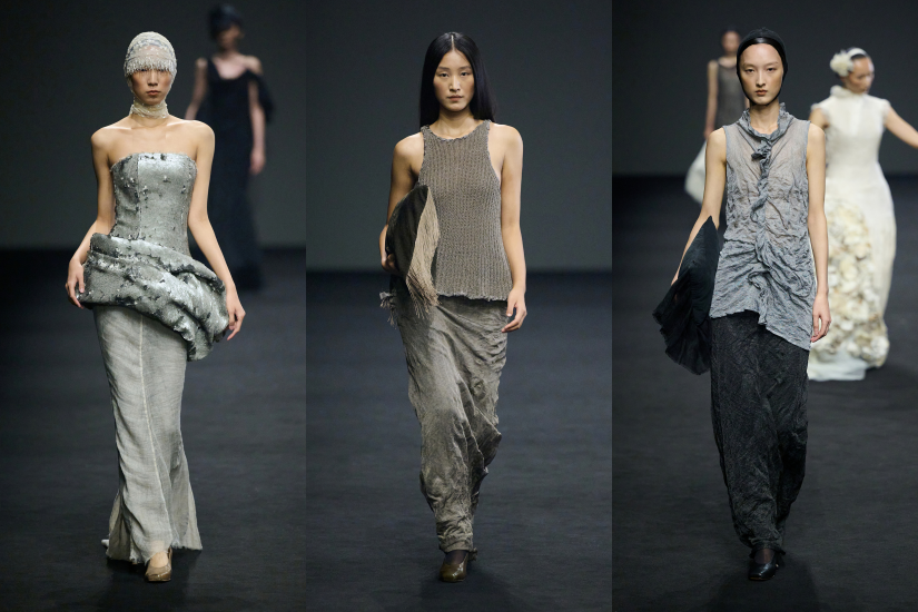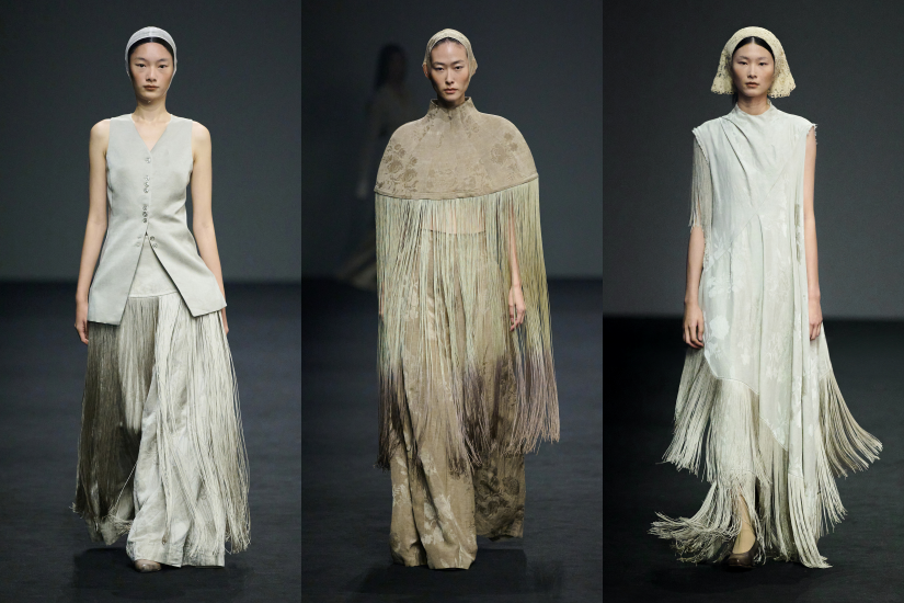 2025 春夏系列名為「SILENT THREADS 靜謐絲語」,我希望透過系列去探索傳承於中西文化中的傳統手工藝和匠人精神。這個系列沿著時間脈絡,從中國到歐洲,跨越了幾個世紀。從起源於中國安徽的「宣紙」開始,中國工匠創造了 一種堅韌光滑、抗腐蝕又抗黴防蟲的紙張,完美結合美感與實用性。我們深入探索源自中國漢代的紙漿工藝, 它最初用於塗漆頭盔和盔甲,後來傳播到歐洲被命名為紙馬謝。本系列重新詮釋了材料中「軟」與「硬」的定義―― 用宣紙將女性的身體鑄型作鎧甲,或將金屬鋼紗織造成有機針織品,並重新想像了束身衣的挺拔造型。