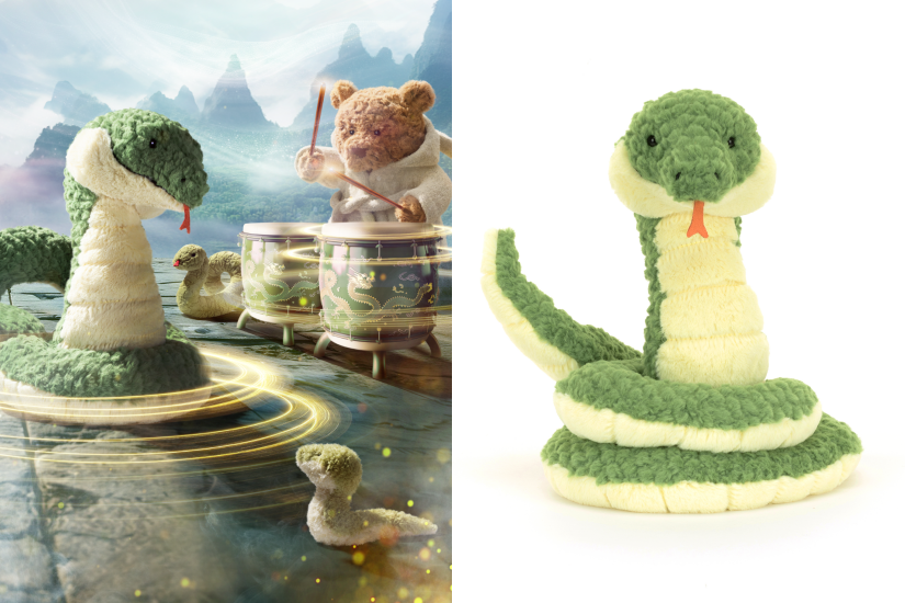 蛇年新春系列,將傳統象徵結合可愛造型,彰顯傳統與創新的獨特魅力。當中包括三位新春夥伴,Cizi 蛇優雅地盤繞在底座上,昂首挺胸,身上綴有對比鮮明的色彩和紋理,搭配精緻的刺繡鱗片,盡顯靈動;Stevie 蛇眼睛烏黑明亮,加上「伸脷仔」,笑容俏皮搞怪; Slither 蛇採用棕色寬條紋燈芯絨和柔軟的雙色羅紋絨毛精心製成,彈性結構能隨心蜷曲或延展,柔軟身軀蜷成一團抱在懷裡,再適合不過!還有小蛇手袋吊飾,迎合人氣不減的「Bag Charm」熱潮!