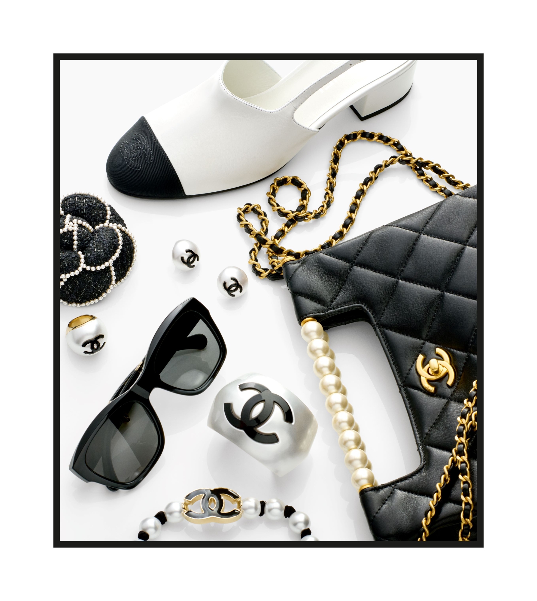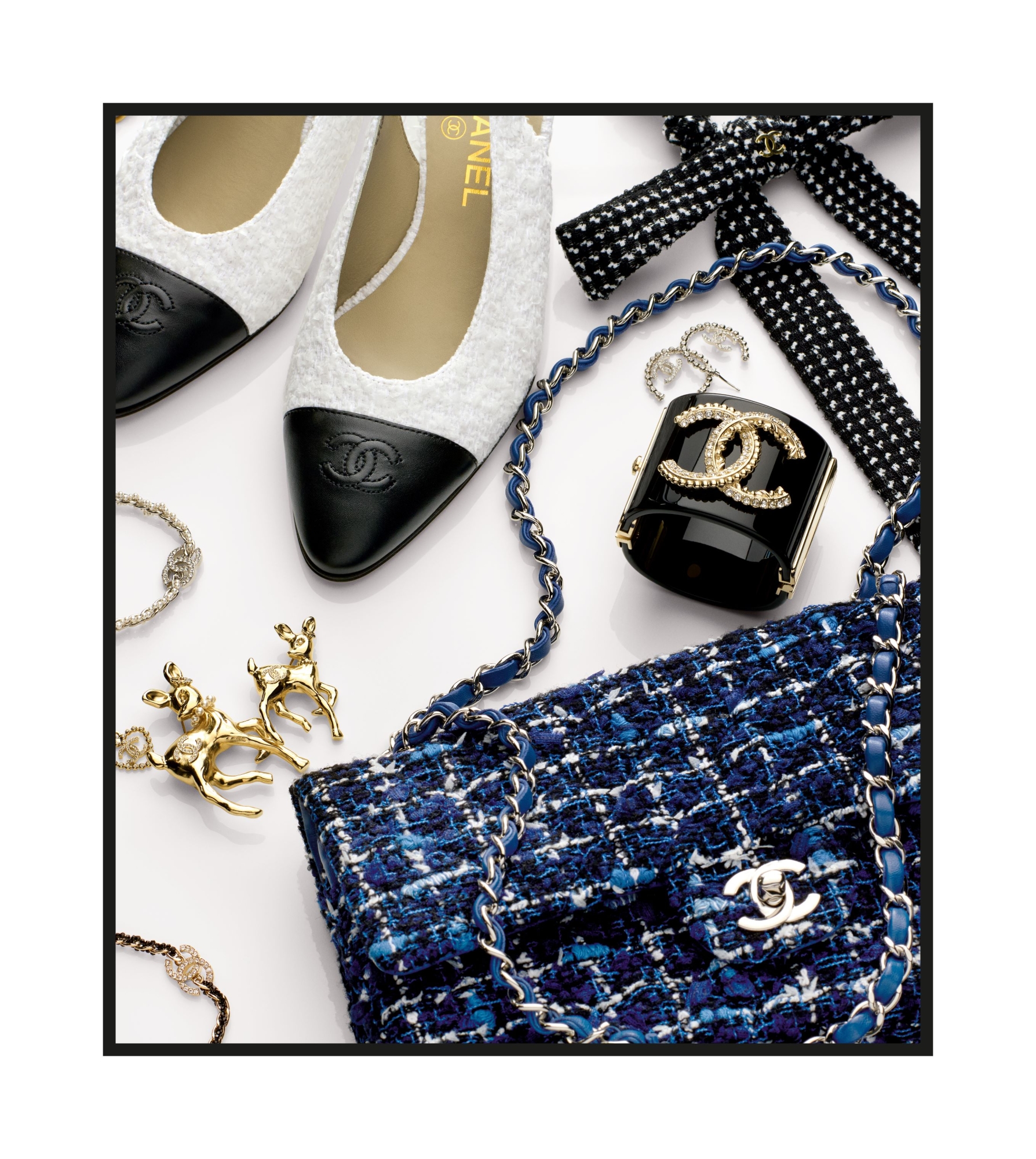 此外,鞋子被改版為厚底鞋或露跟鞋,配有小跟鞋,袖口手鐲上裝飾有雙 C 的標誌隨處可見。從單品視覺圖可以見到一系列配件,每件都是珍貴的物品:帶有蝴蝶結、珍珠首飾、迷你絎縫包、髮夾、太陽眼鏡和山茶花構成了香奈兒魅力。