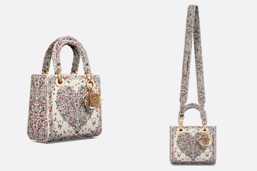 女士對手袋總是難以抗拒,這款 Lady Dior My ABCDior 手袋是 Dioramour 限定系列的作品之一,象徵著品牌對高貴典雅及美麗的追求。手袋以奶白色小牛皮製成,印有 Pietro Ruffo 的多色 Cœur des Curiosités 主題圖案,呈現充滿蜜蜂、蝴蝶和燕子的花卉設計。淡金色飾面金屬 D.I.O.R. 吊飾綴以精細雕刻的心形吊飾,吊飾上飾有小樹脂珍珠,肩帶更可自訂設計,配搭不同徽章,打造最專屬的款式。